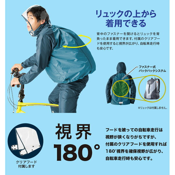 リュック対応のサイクルレインスーツ・背中のファスナーを開けるとリュックを背負ったまま着用できます。